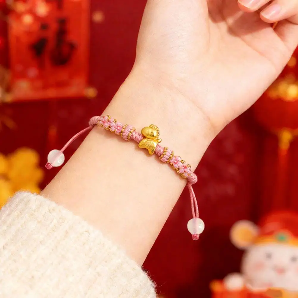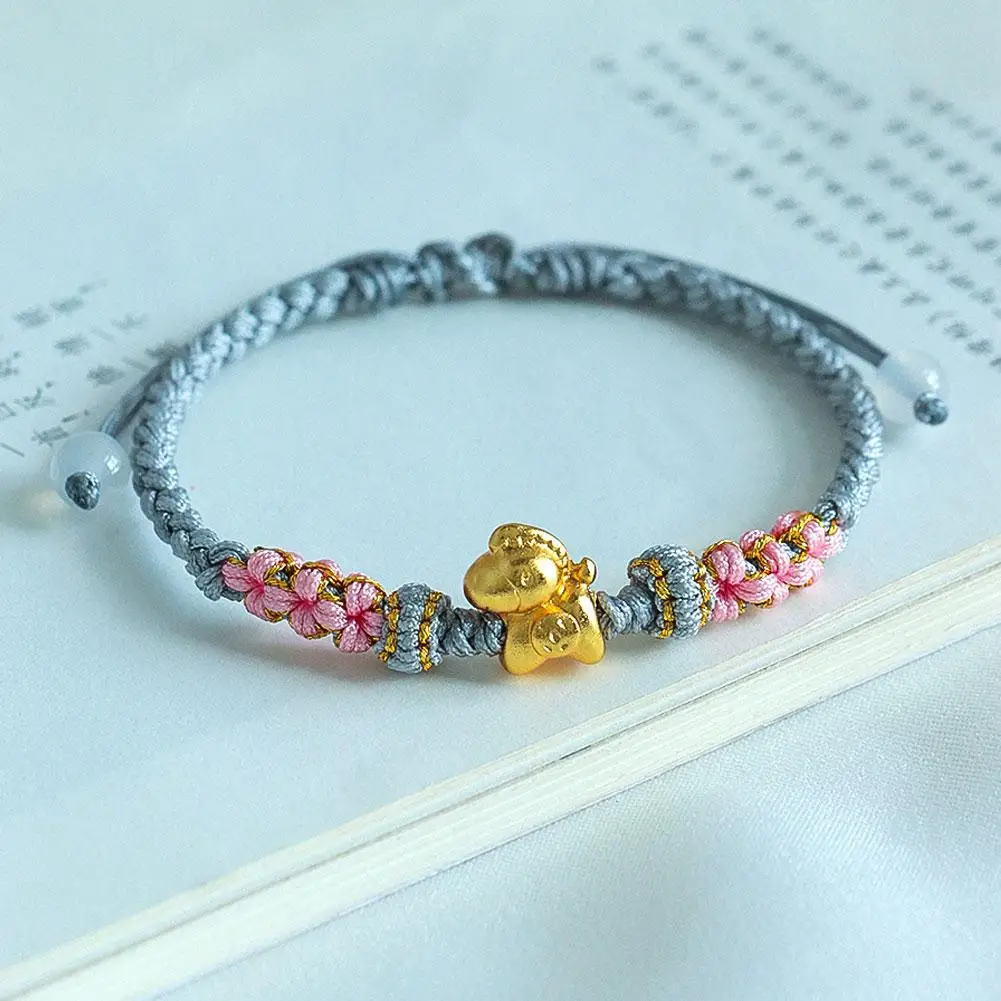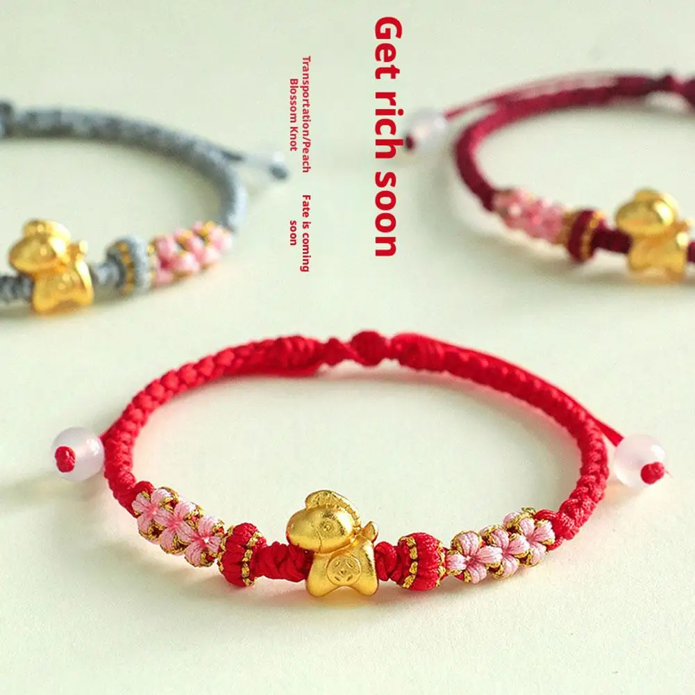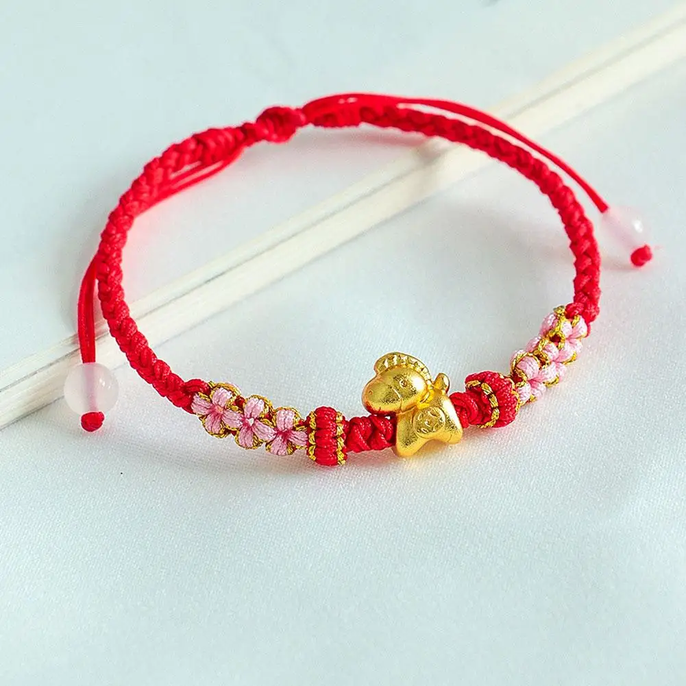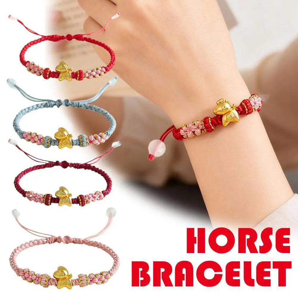 1. Symbol of Prosperity: This exquisite bracelet features a gleaming golden horse charm, embodying the traditional Chinese blessing of “Get rich immediately,” signifying immediate wealth and abundant prosperity. Its beautifully integrated with intricate braided details and delicate pink floral knots, serving as a charming representation of good fortune.