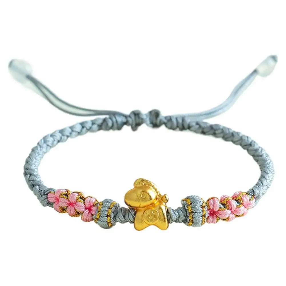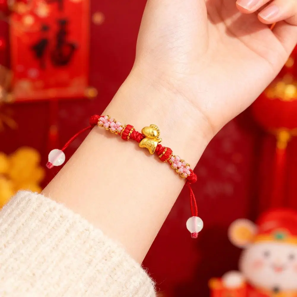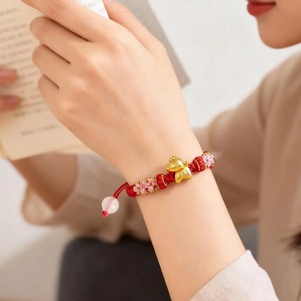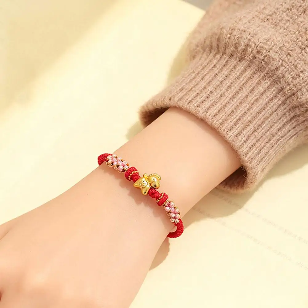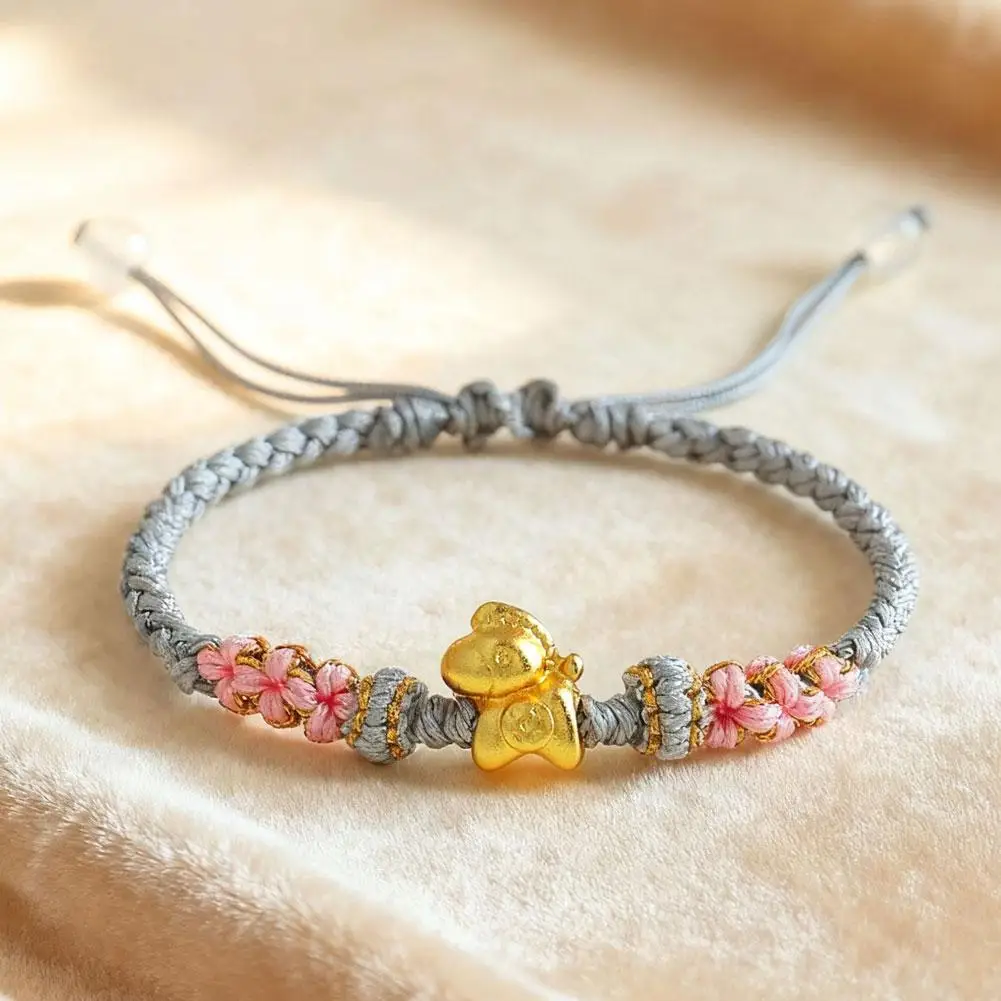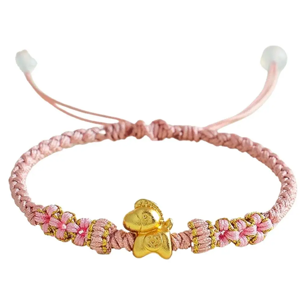 1. Symbol of Prosperity: This exquisite bracelet features a gleaming golden horse charm, embodying the traditional Chinese blessing of “Get rich immediately,” signifying immediate wealth and abundant prosperity. Its beautifully integrated with intricate braided details and delicate pink floral knots, serving as a charming representation of good fortune.